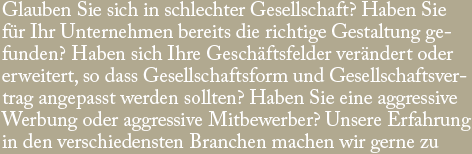 Ein weiterer wichtiger Aspekt im Gesellschaftsrecht ist der Wettbewerb in der jeweiligen Branche. Erfolg am Markt ist regelmäßig auch von geeigneten Werbemaßnahmen abhängig. Die Werbung darf jedoch nicht unlauter sein. Dies gilt für Ihre eigene ebenso wie für die Ihrer Konkurrenten. Hiermit verbundene Fragen bedürfen fachkundiger Beratung, die Sie nicht erst dann einholen sollten, wenn schon konkrete Nachteile drohen. Treten Sie am besten mit uns in Verbindung, bevor die Lage ernst ist.