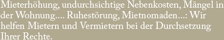 Ist Ihre Nebenkostenabrechnung in Ordnung? Kennen Sie Ihre Rechte bei Schönheitsreparaturen oder bei Mängeln der Wohnung? Sind Sie sich im Falle von Mieterhöhungen unsicher, wie sie sich in rechtlicher Hinsicht am besten verhalten sollen? Was tun bei einer Kündigung?